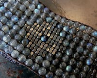 This beaded cuff is woven with luminous labradorite beads and tiny pewter ones. it is approximately 2 inches by 7. A bold piece with mystical stones. Labradoriteis said to promote self-discovery, it is excellent for awakening one's own awareness of inner spirit, intuition and psychic abilities. Labradorite is also the most powerful protector of the mineral kingdom, creating a shielding force throughout the aura and strengthening natural energies from within.