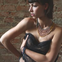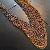 It measures approximately 18" in interior neckline length with a tapered bib measuring approximately 1/2" at base of neck to 3" at front. Elaborately croqueted tiny chains. this necklace has drape and flow. It is simultaneously elegant and casual.
